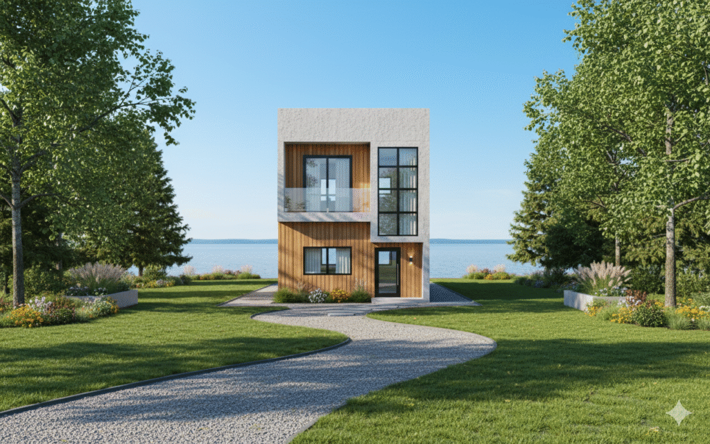 The Lakeside Modernist House delivers a compelling vision of modern residential design, perfectly oriented to capture a pristine waterfront setting. The architecture is defined by a bold material contrast: a robust base of warm cedar cladding anchors the structure, supporting a clean, cantilevered upper volume finished in high-performance white stucco. This duality creates a dynamic, timeless aesthetic.